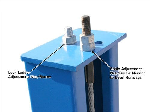 The Atlas® 412 uses a high strength cable system (with a under runway oversized hydraulic cylinder) powered by a 220 volt (single phase) power unit to raise and lower the lift. Many competitors use an “old style” chain lifting system with an exposed hydraulic cylinder system. Old style chain lifts are difficult to “level” properly and the exposed hydraulic cylinder is responsible for numerous “door dings”.
